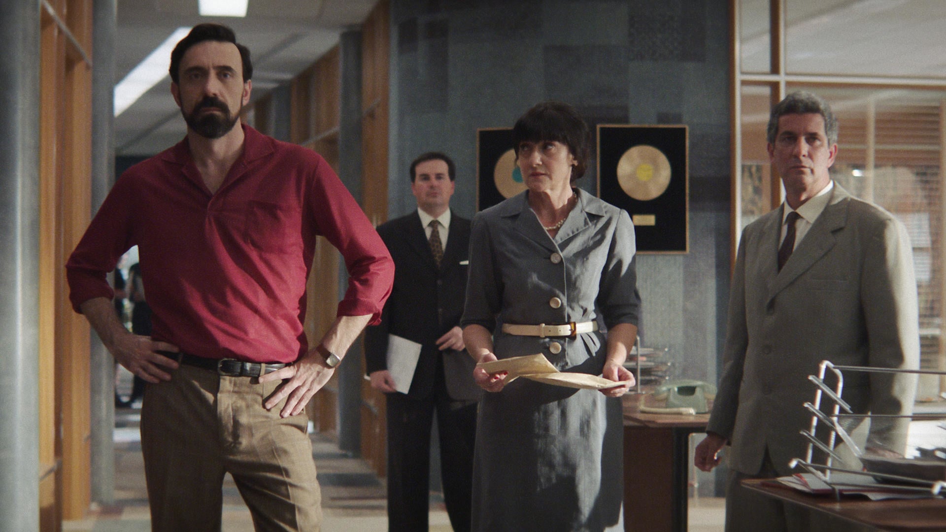 Reprenons. 45 tours part d’un pitch a priori joyeux : Madrid, 1962. Un producteur convainc le boss de Golden, maison de disques qui fait dans la variété traditionnelle et autres flamencos, de créer un label rock, Futura, pour lancer Robert, un jeune qu’il a découvert dans un club. Sauf que, malgré un semblant d’assouplissement, avec, par exemple, l’ouverture du pays au tourisme, le franquisme tourne à plein tube (façon de parler) : les médias sont sous contrôle, tout artiste, du magicien de rue au joueur de castagnettes, est tenu d’avoir un permis d’exercer, délivré par un service à la botte du régime et chaque disque, avant enregistrement, doit être visé par la censure. Ça, c’est pour, disons, l’aspect « professionnel ». On ajoute en toile de fond, un dévouement fortement recommandé à la patrie et à son Général de guide, et une société ultra patriarcale, où la femme est priée de la mettre en veilleuse. Autant dire qu’avoir les cheveux longs et vouloir faire carrière dans le rock’n’roll, n’est pas vraiment la voie la plus « pertinente ».