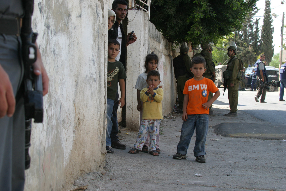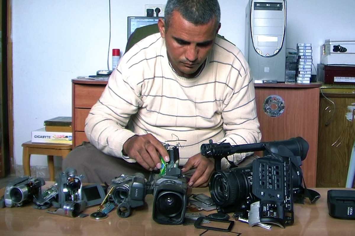 Le film montre pourtant davantage encore qu’il ne prétend offrir au regard. Dans les prises de vue d’Emad Burnat, parfois chaotiques, prises de manière sauvage au cours de manifestations, il est curieux de voir comment la résistance du village gagne elle-même en notoriété : dans le champ, d’autres caméras apparaissent, qu’elles appartiennent à la presse, aux amateurs ou aux associations, pour pouvoir elles aussi documenter la lutte. La caméra devient elle-même à la fois un outil, une arme et une protection – d’où ces plans terrifiants où la caméra est atteinte, sauve la vie de son propriétaire, et finit par rendre l’âme sur le champ de bataille. Le film se transforme parfois en leçon d’obstination ; lorsque les soldats viennent frapper à sa porte, Emad Burnat continue de braquer sa caméra, arguant de son droit de filmer, en tant que journaliste improvisé, sur son territoire. En creux, nous comprenons que la lutte passe autant par les manifestations pacifiques organisées directement face à l’armée, que par l’accumulation et le montage de ces images prises tant que l’on peut encore filmer. Emad Burnat filme pour son dernier-né, et le petit Gibril grandit au fur et à mesure que les images sont de plus en plus graves et pesantes ; mais le réalisateur reste conscient qu’au travers du fils, le spectateur perd lui aussi sa naïveté.