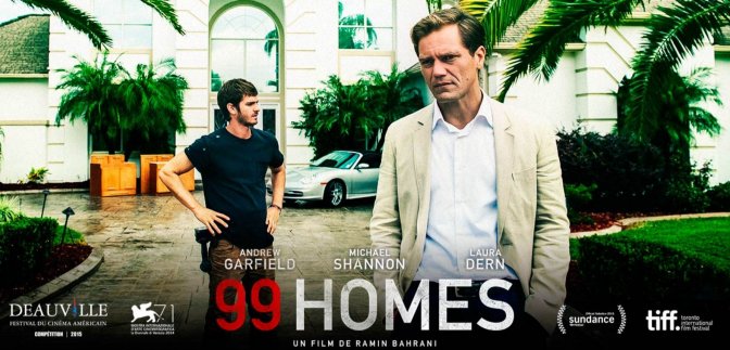 Le film : Qu’importe le classicisme échevelé de 99 Homes, sa structure en miroir convexe et son soleil de plomb aussi noir que la nuit en font une œuvre des plus habiles. La crise des subprimes et les maladresses de l’administration états-unienne apparaissent comme le vecteur d’un monde où les opprimés deviennent à leur tour charognards en un épineux syndrome de Stockholm. Via un glissement pervers et insidieux, Ramin Bahrani met ainsi en scène l’inexorable mutation de Dennis, expulsé de sa maison manu militari, en despote malgré lui. Comme si cette société véreuse et vénale, non contente de vampiriser les plus démunis, transformait peu à peu par capillarité ces derniers en sbires à sa solde. Il y a dans ce dispositif quelque chose de L’invasion des profanateurs de sépultures, comme si des cosses impassibles remplaçaient l’humanité - l’archétype de ce degré zéro de sensibilité n’étant autre que Rick, post-humain jadis vendeur pour qui même l’économie de la pitié n’est plus qu’un lointain souvenir. Malgré des idées de mise en scène rarement originales hormis quelques plans séquences fastueux et l’allégorie de Dennis emporté par le Déluge, 99 Homes dresse une critique plutôt fine de l’Amérique. En cyborg déshumanisé (mais paradoxalement curieux de jeter un œil sur le sac mortuaire sortant de la maison), Michael Shannon rivalise d’ingéniosité. À noter enfin le motif de la mappemonde en amorce et en clôture de métrage, symbole d’une Amérique sens dessus dessous.