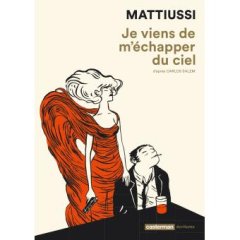 Quand Laureline Mattiussi rencontre Carlos Salem, l’œuvre qui en ressort fait l’effet d’un très bon porto : très fort et très noir. Je viens de m’échapper du ciel est un album à la fois teinté d’une ambiance polar et onirique comme de la poésie, un Hemingway qui aurait traversé Vargas de plein fouet, avec des soubresauts qui n’appartiennent finalement ni au policier, ni à la poésie. Un savant mélange de tranches de vie mal découpées, de fantasmes inassouvis et de bars et d’alcools frelatés qui donnent une réelle ambiance et en fin de compte un sens à toutes ces pages. Le jeu de noir et blanc, contraste perpétuel avec une ville inconnue et innommée en toile de fond, souligne cette impression de soir, de crépuscule permanent sur les personnages, qui ne donnent finalement que peu d’eux-mêmes, se contentant de subir, de passer, de marmonner. C’est en fait une plongée que propose Mattiussi, car au départ tout semble assez calme, plat, peut-être trop lisse. Mais rapidement, les petits dialogues, les pensées intérieures du héros, les interventions célestes donnent un cachet à l’ouvrage, le rendent sensible, attachant.