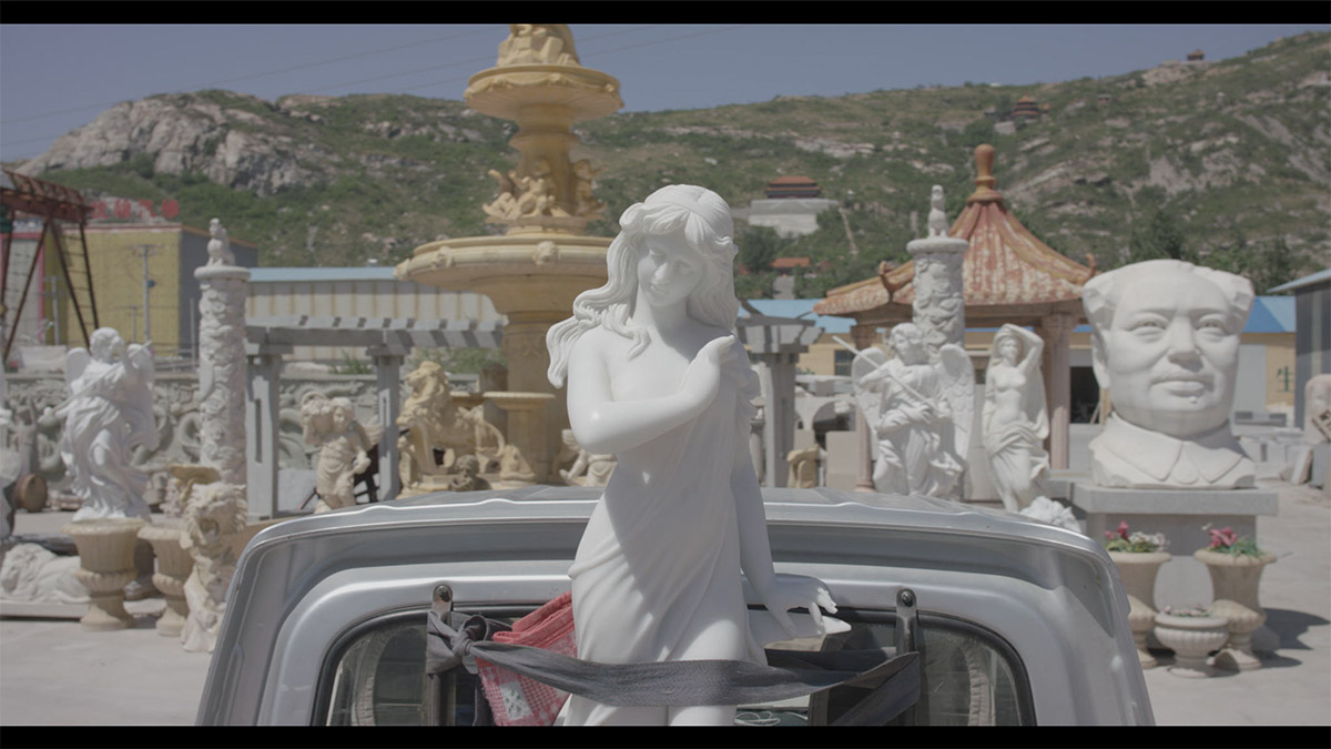 La caméra les quitte. Une série de séquences nous mène tantôt dans une carrière de marbre, tantôt dans un port industriel où les containers font un écho formel aux blocs de marbre. Arrivée en Chine. Dans un glissement torpide, le chemin de la pierre prend forme. Un entrepreneur français encadre des chantiers de construction, veillant jalousement sur le travail du marbre et sur ses coûts. Un sculpteur chinois reproduit en mieux la sculpture classique européenne, pour satisfaire aux nouvelles lubies de ses compatriotes. Des négociants en gros achètent et vendent les objets manufacturés du monde entier. Une petite fille peint des magnets, obtenus à partir de poudre de marbre, voués à repartir dans les boutiques de souvenirs de toute l’Europe. L’absurdité du trajet mondial et ses répercussions absolument inattendues ont ici une poésie cauchemardesque et l’apesanteur figée des mondes muets de De Chirico.