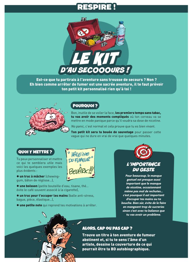 Cette BD permet d’aborder le thème des méfaits du tabac, les avantages d’arrêter la cigarette et les situations que l’on peut rencontrer. En effet, la BD, constituée majoritairement de gags en une planche, insère quelques pages informatives, simples d’accès, sur des thématiques tournant autour de la cigarette, tabagisme passif, gestion de l’effet de manque, influence physique et physiologique de l’arrêt de la cigarette. Ces pages comportent des illustrations afin de ne pas être trop austères. À côté de cela, des informations passent aussi dans les gags au fur et à mesure que tout le groupe prend ses distances avec le tabac.