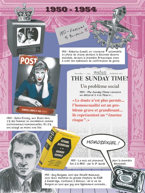 Reprendre chronologiquement les années de lutte pour les droits LGBTQI + (cinq années à chaque fois) pouvait apparaître comme une tâche ardue pour faire le bilan d’une lutte acharnée pour des droits et de la dignité de l’homosexualité. Pourtant, en faisant des doubles pages en forme de carnets, où des gros titres de journaux, des dessins tirés de photos, des slogans, des tracts, cet aspect guide et historique passe de fait extrêmement bien, tout comme les doubles pages qui tentent de résumer les vies, les folies ou les transgressions des grands noms de combats féministes, d’une éditrice chevronnée à un acteur sorti du placard, faisant apprendre des biographies succinctes au lecteur, qui voit défiler des guerrières défiant un conservatisme brutal, des préjugés intolérables, des carcans inamovibles... Et pourtant, ce que l’on préfère, ce sont les pages autobiographiques, celles qui forme le récit de la vie de Kate, depuis son enfance où elle préfère les jeux de garçon à la soixantaine où elle doit prendre soin de sa mère, réfractaire car probablement lesbienne refoulée.