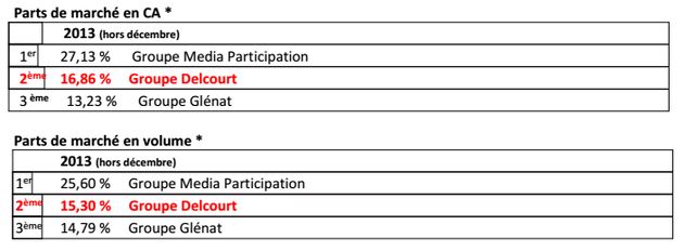 "En 2013, l’institut GfK place donc le groupe Delcourt en 2e position du marché de la bande dessinée en parts de marché en volume et en chiffre d’affaire."