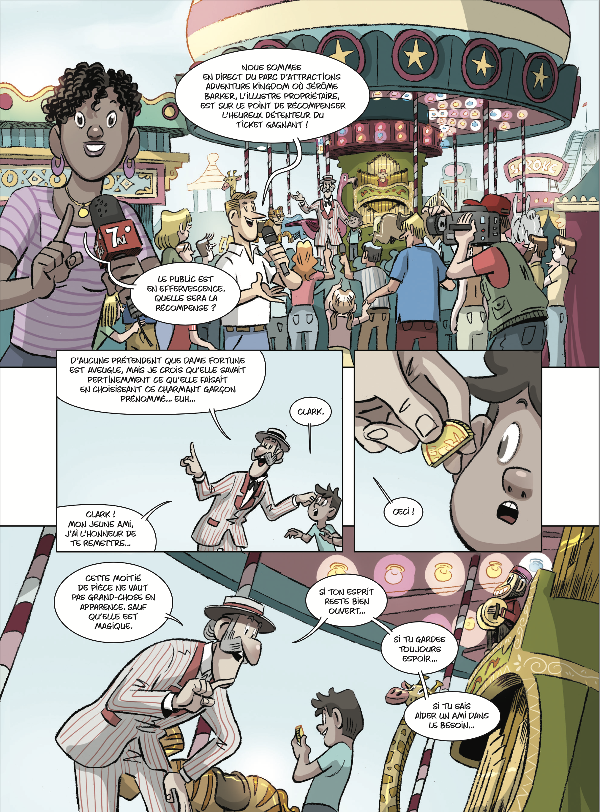 Résumé : Ce premier volume débute dans le parc d’attraction « Adventure Kingdom » où le jeune Clark gagne une demi-pièce magique remise par le créateur du site en personne. Cinq ans plus tard, Aventure Kingdom est fermé, laissé à l’abandon, et Clark, devenu explorateur et « influenceur », se filme dans l’exploration des lieux. Il tombe sur une jeune fille, Karoline. Ils ne savent pas encore qu’ils sont tous les deux liés par le parc et que de nombreuses aventures les attendent...