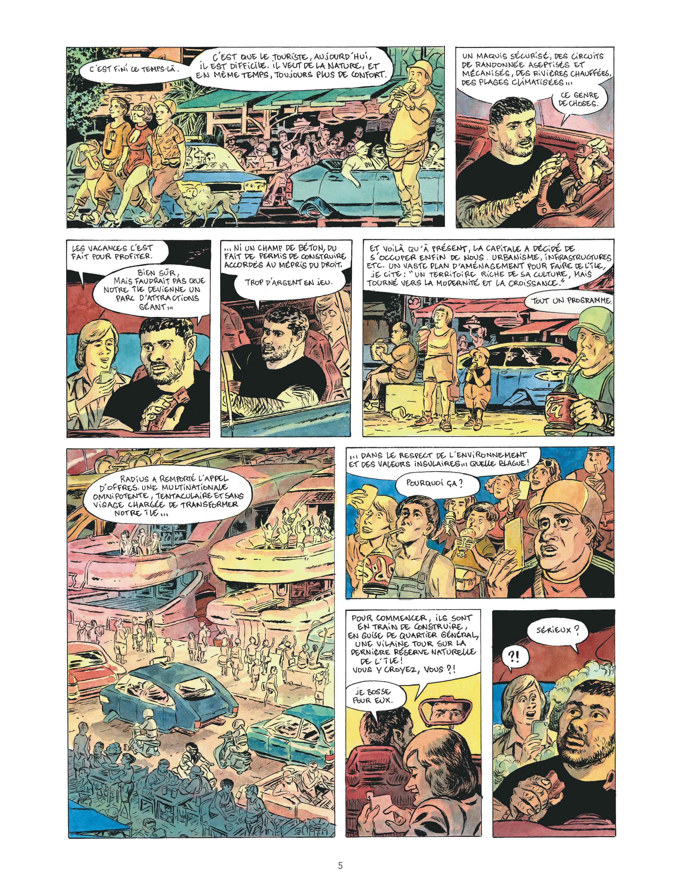 Ce récit est mené tambour battant, mais cela n’empêche nullement Hugues Micol d’accorder de l’importance aux détails qui crédibilisent cet univers : aménagements des lieux, objets… Surtout, le fond suit la forme par sa richesse, Micol abordant des questions économiques, environnementales et politiques, pointant leurs liens, sans que cela n’entache la fluidité de la narration. Enfin, le personnage central, Agughia, cette « petite anguille », intemporel et bien d’aujourd’hui, étonne et se révèle particulièrement attachant.