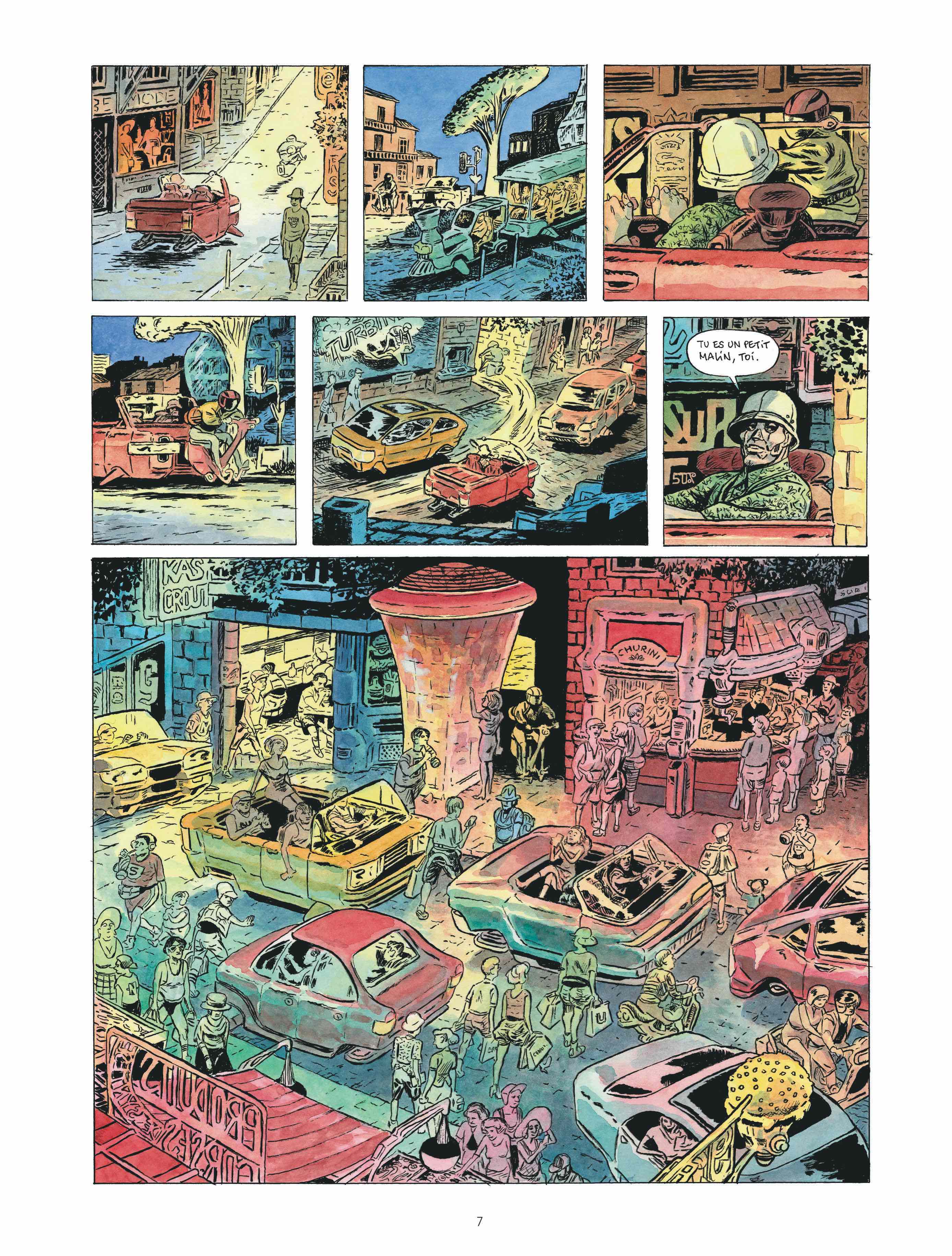 Ici, les situations, souvent denses, sont représentées par un dessin luxuriant aux couleurs acidulées, nombreuses et variées. Cette forme visuelle correspond pleinement à l’histoire qui, si elle suit en définitive une ligne plutôt droite et assez précise, n’hésite pas à enrichir les scènes de rebondissements, retournements de situations…