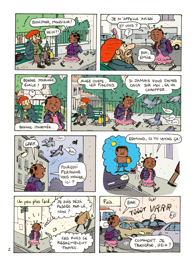 Résumé : Akissi et son frère Fofana débarquent à Paris. Ils sont accueillis chez un oncle de leur mère. Dès le premier jour, la jeune fille se rend à son collège et est surprise par la vie de la capitale française : les voitures qui s’arrêtent pour laisser passer les personnes traversant sur les passages piétons, les pigeons qui pullulent… Presque immédiatement, elle souhaite rentrer dans sa Côte d’Ivoire natale. Mais elle s’accroche et, au fil des jours, s’adapte et met toujours un peu plus dans sa poche son nouvel entourage.