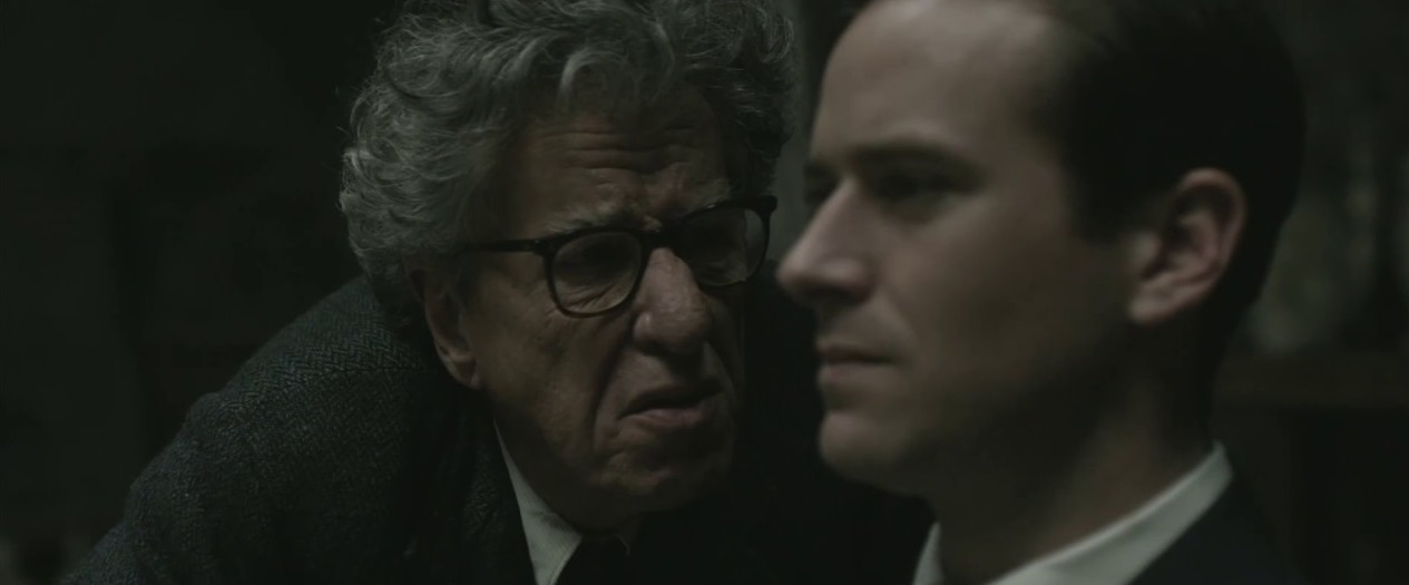 Si Geoffrey Rush a de toute évidence réalisé un gros travail pour ressembler un maximum à Alberto Giacometti, offrant à ce portrait son regard malicieux malgré les épreuves que vit le personnage, la confusion vient finalement de son comparse Armie Hammer. Quiconque a vu Call me by your name ne pourra que constater une certaine continuité entre les deux films et surtout entre les personnages interprétés par le comédien : il s’agit à chaque fois d’un jeune américain homosexuel de passage en Europe qui s’intéresse aux arts. Physiquement, les deux personnages sont des copies conformes, au point que l’on imagine parfaitement le jeune Oliver pénétrer dans l’atelier de Giacometti avant de rentrer aux États-Unis ! Ce qui n’est qu’un hasard pourra combler le cinéphile facétieux, à moins qu’il se dise que les similitudes entre les deux personnages auraient dû gêner l’acteur au moment de donner son accord.