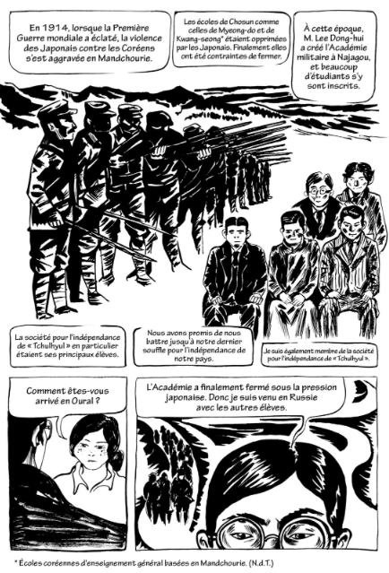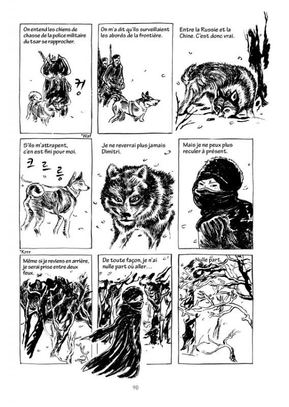 Le noir et blanc charbonneux de l’autrice offre quelques belles planches, en particulier lorsque les scènes qui se déroulent sous la neige. Le découpage et le trait privilégient le mouvement, ce qui confère une impulsion bienvenue à un récit parfois bavard. On peut regretter l’absence d’une préface d’un tiers qui contextualise le récit ou explique le choix de cette figure – charismatique mais inconnue du lecteur – par l’autrice. Est-elle célèbre en Corée ? Son combat a-t-il été reconnu par l’URSS victorieuse de la guerre civile ? Malgré cette absence, Alexandra Kim la Sibérienne transporte efficacement le lecteur dans un Extrême-Orient très éloigné des représentations fantasmées que peuvent en avoir les Occidentaux. Il confirme le talent de Keum Suk Gendry-Kim, qui traite avec pertinence des sujets difficiles et s’affirme comme une passeuse de culture entre la Corée et la France pour son rôle de traductrice et de dessinatrice.