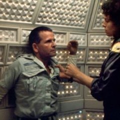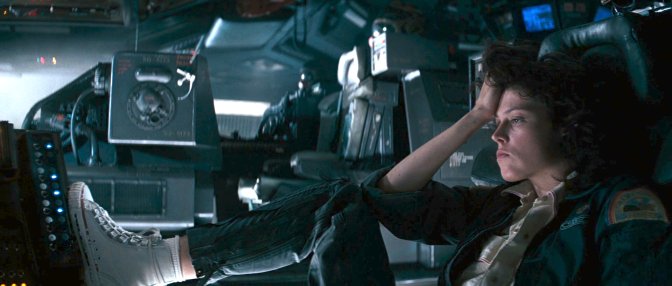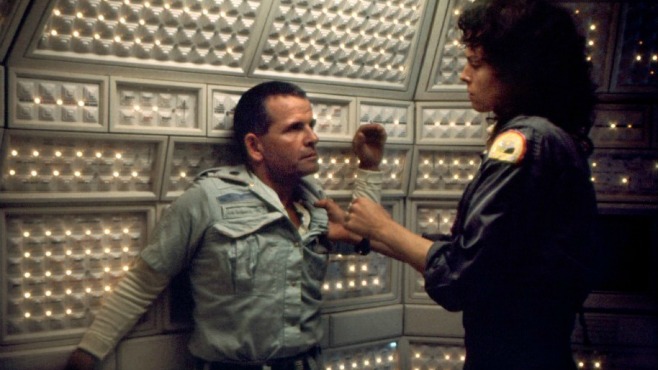 L’enjeu littéraire et conceptuel d’un androïde se distingue-t-il de celui relatif au monstre ? Pas si sûr, tant chacune de ces figures contribuent à leur manière, de façon diamétralement opposée, à questionner notre rapport au désir, à mettre à nu nos contradictions et inhibitions. Les velléités sanguinaires de l’alien, exacerbation de l’éros et du thanatos, font écho au simulacre d’instinct de conservation et de volonté de Ash, mais aussi à sa négation structurelle de l’existence et de ses oscillations. Au centre de ce système polarisé par deux extrêmes gravite Ripley, qui transige avec le désir de mort de l’extra-terrestre, et avec le détachement immanent du synthétique. Plusieurs rencontres décisives entre ce dernier et la jeune femme jalonnent Alien. Où chaque fois le visage impassible de Ash, comme feignant une sorte d’adversité sur fond d’intuition scientifique, se confronte à celui, dur mais aimant comme une mère, de Ripley. Une cosse mécanique aux dispositions essentiellement physiques se heurte à un sujet organique doté d’inclinations psychologiques.