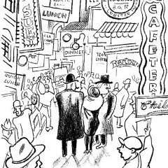Le noir et blanc renvoie également au cinéma de l’époque, et certaines mises en scène, notamment avec les décors de ville où avance notre trio, nous rappellent l’expressionnisme. Surréalisme et symbolisme sont également présents. Chaque page de cette BD est constituée d’un dessin, souvent sur une planche et parfois sur une double page. Le contraste fort du noir et blanc est atténué par une technique de petites tâches noires qui créent des zones de gris et apportent des de l’obscurité. On est bluffé par le talent de William Gropper qui campe en quelques traits ses personnages, ses décors, et nous entraînent ailleurs. Au fil des pages, on s’arrête sur un dessin, une mise en scène, voire une ligne !