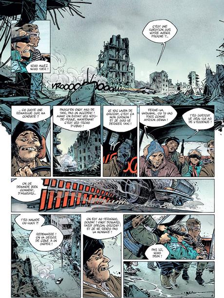 Le découpage se démultiplie et reste centré sur les personnages. Seules quelques cases permettent soudain de rendre l’ampleur du décor, des champs de destruction qui entourent les personnages.