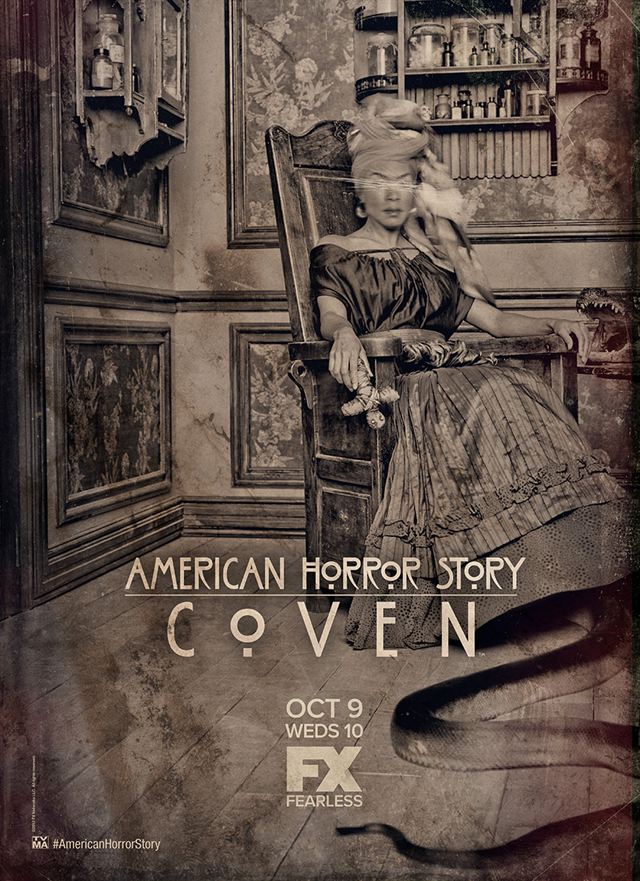 La troisième saison d’American Horror Story est annoncée en grande pompe sur la chaîne américaine FX à partir du 9 octobre 2013. Le générique de cette nouvelle série d’épisodes vient d’être dévoilé sur la toile, dans une ambiance sinistre et lugubre à souhait, sur fond de sorcellerie. Une série de teasers graphiquement soignés mais plutôt courts et ne dévoilant quasiment aucun élément susceptible d’en apprendre plus sur cette saison 3 est également disponible. Les affiches de promotions révélées ces dernières semaines valent elles aussi le coup d’œil.