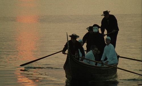 Critique : On plongeait dans le carnaval au cours d’une scène du film Les filles (1968) de Mai Zetterling. Ce rituel est repris au début d’Amorosa (1986), où des barques remplies de personnes au visage masqué, voguent sur l’eau calme de Venise, dans l’incandescence du soleil couchant. Agnes von Krusensjterna (magnifique et hypnotique Stina Ekblad), écrivaine sujette à des crises schizophréniques, est emmenée à l’hôpital psychiatriques aux côtés de David Sprengel (qui n’est pas encore son époux). Son état de folie, d’angoisse, et de délire passe quasiment inaperçu au sein de l’ambiance festive, et les Vénitiens costumés qui naviguent devant elle reflètent ses peurs les plus intimes : la mort. Les plans semblent épouser sa vision interne, sont capturés d’un point de vue subjectif. Plus tard, alors que la crise s’est atténuée, elle embarque à bord d’une pirogue, accompagnée de Sprengel : le mouvement lent de l’eau, du bateau qui avance, au sein d’un travelling, et la verbalisation de ses pensées, font penser à un mouvement imageant son propre cheminement intérieur : elle raconte qu’elle aimerait écrire sur sa famille, replonger dans la confusion des liens de parentalité, dans le milieu dans lequel elle a grandi : l’aristocratie. Le reste du film n’est qu’une critique de ce monde où Agnes ne se sent pas à sa place, est en décalage.
