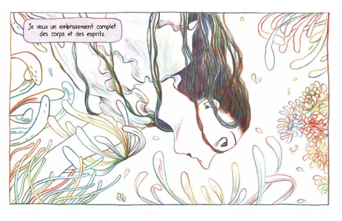 Des dessins au crayon multicolore, s’évade la liberté entière d’Anaïs Nin. Elle était rebelle, autodidacte, sensuelle, aquatique, c’est tout cet univers riche et personnel que l’on retrouve ici, plongée visuelle permanente dans des limbes arc-en-ciel délicats.