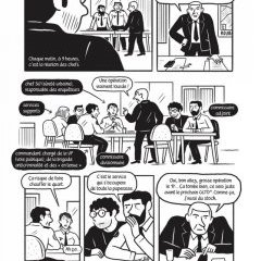 Le dessin stylisé de Bouqé joue sur le contraste du noir et du blanc, sans nuances de gris, et s’adapte bien à la contrainte du documentaire : certaines métaphores sont bien senties, comme les poupées russes pour décrire le fonctionnement hiérarchique. Porté par ce dessin efficace, l’album évite les narratifs trop longs et fluidifie la lecture.