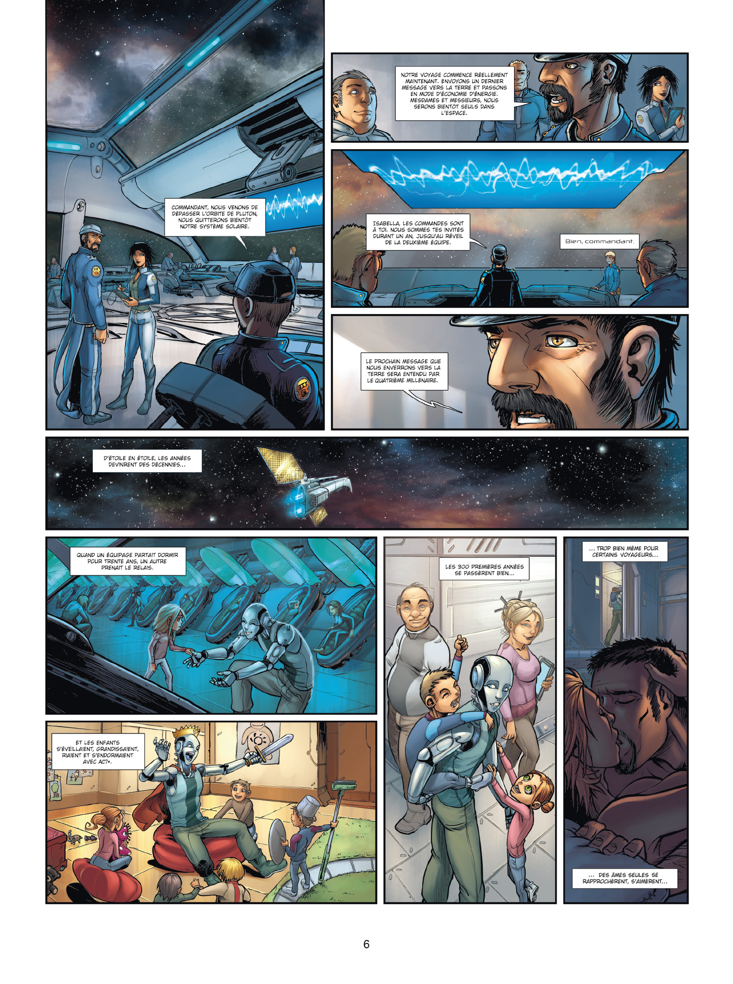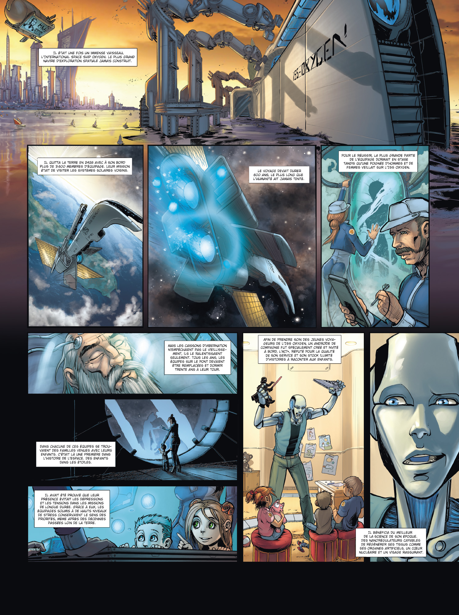 C’est bien un tome 2, mais ce n’est pas une suite. « Heureux qui comme Ulysse », cette maxime du poète Du Bellay, fait parfaitement la transition entre le mythe antique grec du roi d’Ithaque, et cette vision futuriste du professeur robot, Homère des temps à venir. C’est une nouvelle histoire qui débute (et se termine), faisant toujours la part belle aux androïdes. Ou plutôt un seul androïde. À bord de l’ISS Oxygen, vaisseau de colonisation lancé vers les frontières de la galaxie, AC7+ a pour vocation de raconter des histoires aux enfants. Sur le périple, des astéroïdes mettent à mal l’expédition, qui devra rebrousser chemin vers la Terre. À bord, un seul survivant, le petit Ulysse. Pour le scénario, on pensera au récent Terra Prime qui avait déjà abordé cette thématique du voyage interstellaire avec une communauté livrée à elle-même... Mais comme pour la série BD, ce point psychologique reste non-élucidé, et le fil se concentre finalement sur cette bonne vieille Terre, qui n’a pas été épargnée en cinq cent ans...