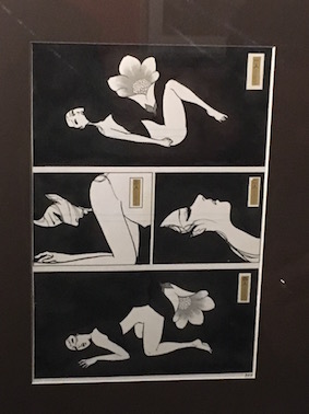 Présenté pour la première fois en France, le travail du japonais Kazuo Kamimura, mort en 1986 à 45 ans, après une courte mais intense vie de jouissances, énonce progressivement sa puissance au cours de l’exposition qui lui était consacrée. Si les premières planches aperçues laissaient tant soupçonner la splendeur du trait qu’une certaine mièvrerie des sujets - portraits de femmes aux visages légèrement penchés en signe de fragilité, fleurs en éclosion…- les cimaises suivantes faisaient place à un érotisme aussi délicat qu’ardent. Maitre du gekiga, ces « dessins dramatiques » adressés aux adultes, Kamimura parcourt l’intimité des hommes et femmes japonais(es) des années 60-70. L’admirable jeu de clair-obscur affirme ainsi les dualités à l’œuvre dans la difficulté à vivre en couple, ou dans une sexualité explorant ses libertés.