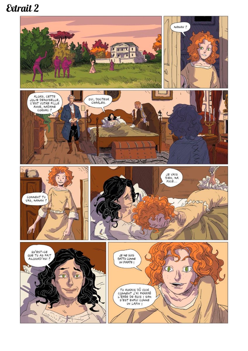 Le scénariste prend le parti d’exploiter le flou romantique enveloppant Anne Bonny, pour en livrer une interprétation très libre et romancée, parfois bien manichéenne – format court du support oblige peut-être… Son enfance illégitime et non-conventionnelle est bien évoquée, mais on regrette un peu que sa si riche, bien que brève, vie de femme ne soit qu’esquissée, qu’on devine notre héroïne bien moins indépendante qu’elle ne le fut apparemment : elle a été pirate sous des habits d’hommes, y compris sans ses amants pour l’accompagner ou la protéger, sa probable histoire homosexuelle avec Mary Read n’est pas même évoquée, pas plus que leur comportement transgenre alternatif. Son caractère d’enfant gâtée « soupe au lait » est bien rendu, mais rien n’est dit de ses actes de sauvagerie gratuite. Le réalisme de sa capture, sur un bateau quasiment pas défendu par ses pirates ivres morts semble respecter les témoignages, mais on aménage ensuite une sortie de prison façon Disneyland, pour offrir un (trop) beau happy end à un personnage fictif qui démontre bien plus de droiture que la réelle Anne Bonny. Un parti pris des auteurs, qui semblent pourtant vouloir livrer une certaine réflexion sur la condition de la femme du XVIIIe siècle.
