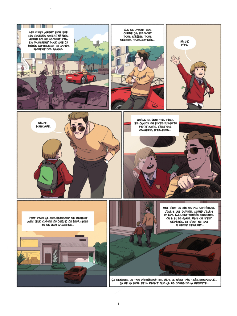Côté dessin, le foot pourtant primordial et environnement de l’histoire, n’est pas non plus montré jusqu’à l’écœurement. C’est plutôt les appartements luxueux, les salles fastueuses et les secrets des vestiaires qui sont évoqués, la pelouse et ses acteurs apparaissant à l’occasion, plutôt pour un entraînement qu’une finale d’ailleurs. Tout un symbole, le match contre Bordeaux, où la famille vient assister, n’est même pas montré, éludé, comme si les 90 minutes de jeu n’étaient désormais que secondaires dans ce monde de fric. Ainsi, les amateurs regretteront peut-être les détails absents d’un maillot, d’un stade, d’un club, car les droits ne pouvaient évidemment permettre d’apposer les logos du PSG ou des Girondins...