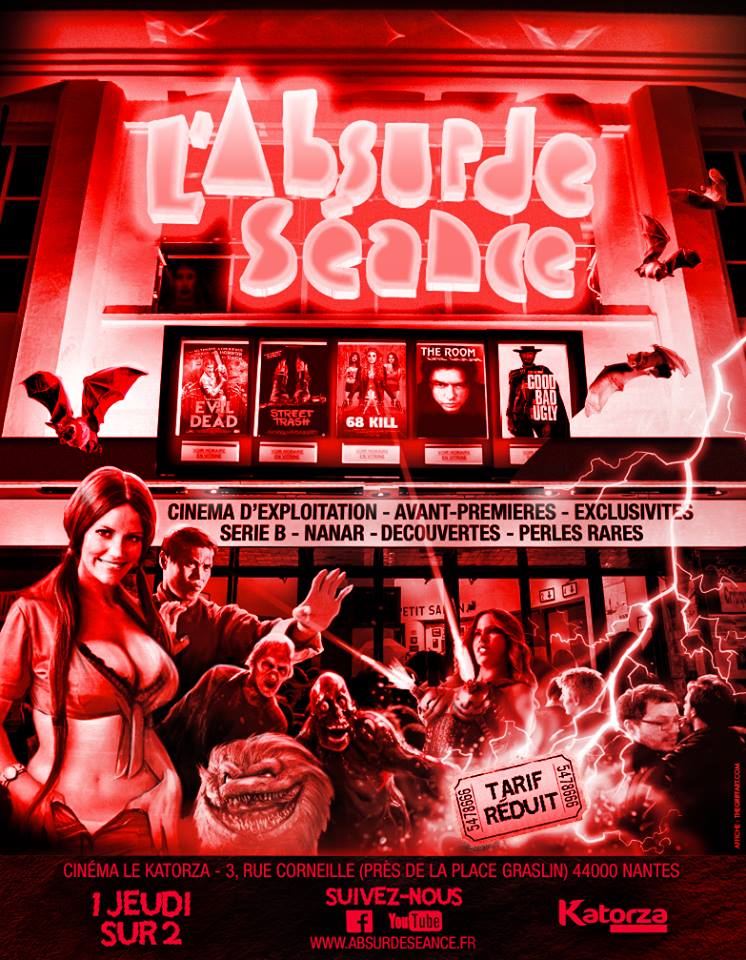 Le Festival : Nous avons tous nos déviances : les spectateurs adeptes de l’Absurde Séance nantaise du cinéma le Katorza n’en ont que trop conscience, eux qui prennent un plaisir monstre à se rendre, un jeudi sur deux, à ces projections exclusivement dédiées à un cinéma à la fois déviant, réjouissant, dérangeant, extravagant, faisant autant la part belle aux pépites méconnues qu’aux grandioses navets : tout un pan de septième art qui régale particulièrement l’instigateur de cette impertinente Séance, Jean-Maurice Bigeard, dont la cinéphilie très orientée (instiguée par les classiques des années 70-80 – Vendredi 13 ou Cannibal Holaucost en tête de file – ou des lectures comme les magazines L’Écran fantastique ou Vampirella…) est en filiation directe avec l’identité de l’Absurde Séance.