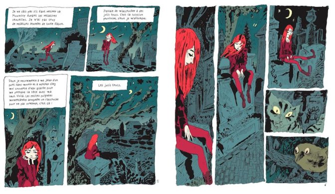 Toute la rage d’un état entre deux âges est concentrée dans ces 140 pages, ce flottement traduit par les virées nocturnes volantes d’Aspirine au-dessus des toits Paris, où elle touche du bout des doigts son évolution mais où elle reste arrimée à l’enfant qui est en elle, contre sa volonté. Questionnement permanent, son état est éternel…