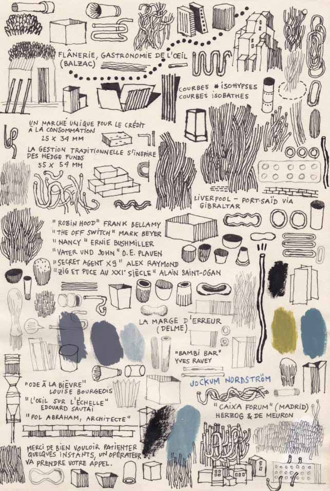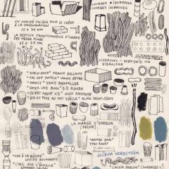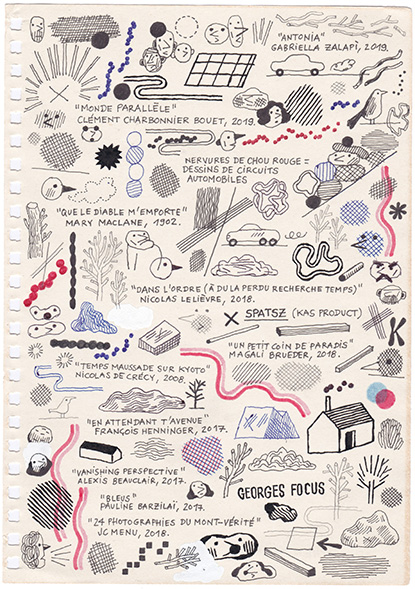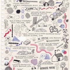 Carnet de dessins téléphoniques où les références culturelles se mêlent à des notes factuelles, des mentions mathématiques, à des jeux de couleurs, de formes et surtout à des dessins automatiques qui se déploient dans la page et la remplissent pour offrir une composition dense et légère à la fois.