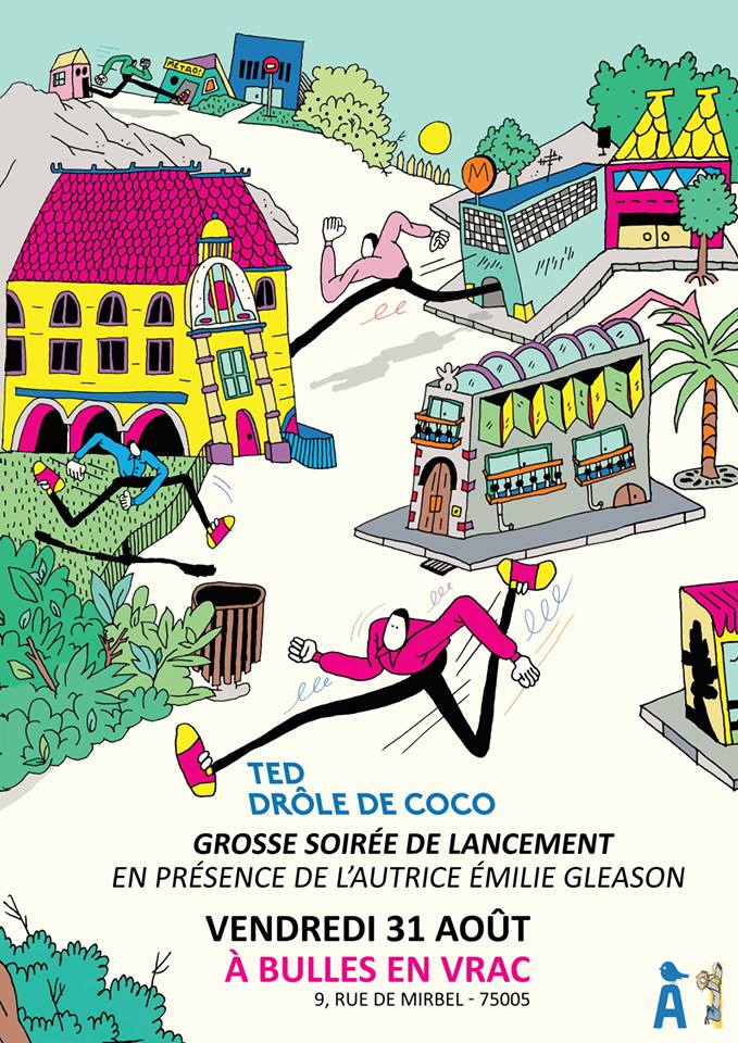 Enfin, l’éditeur fait paraître au mois d’août Ted, drôle de Coco d’Émilie Gleason, jeune autrice et illustratrice qui a débuté sa carrière éditoriale aux États-Unis avec Salz & Pfeffer (2015). Cet ouvrage au graphisme coloré met en scène la vie de Ted, inspiré du vécu du frère de l’autrice, diagnostiqué Asperger. Loin d’une bande dessinée « témoignage » au propos lénifiant, l’éditeur promet un moment de lecteur immersif et survolté, porté par le trait vif et enthousiaste d’Émilie Gleason, qui a récemment réalisé pour la jeunesse Les gros bras de Polka chez Biscoto éditions. À noter que l’autrice sera présente à la librairie parisienne Bulles en vrac le vendredi 31 août pour une soirée de lancement de son ouvrage. La librairie exposera également plusieurs planches de l’ouvrage.