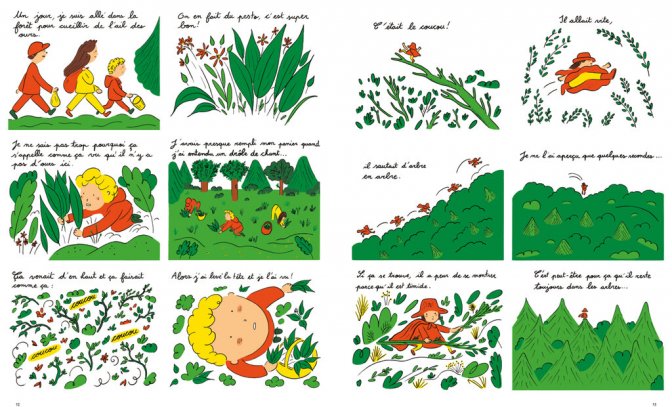Le dessin de Charline Collette est simple et terriblement ingénieux. Son trait respire, invente de nouvelles formes, évite le didactisme, tout en demeurant très compréhensible. Si, par rapport à ses précédents ouvrages, l’auteure sacrifie quelque peu son travail particulièrement intéressant de la matière (mais que l’on retrouve dans chaque interlude dans de somptueux paysages), elle gagne considérablement en intelligence graphique, même si on pourrait lui reprocher un rapport texte/image qui frise la redondance et aurait gagné à plus de souplesse. Ses planches sont remarquables en tout point, se laissent parcourir avec un réel plaisir et devraient enchanter les jeunes lecteurs, comme les moins jeunes : elles communiquent l’envie de partir dans de longues randonnées en forêt, pour se reconnecter avec l’essentiel. À noter que, pour ce livre, Charline Colette a récemment reçu le prestigieux prix Révélation « Livre Jeunesse » de l’ADAGP.