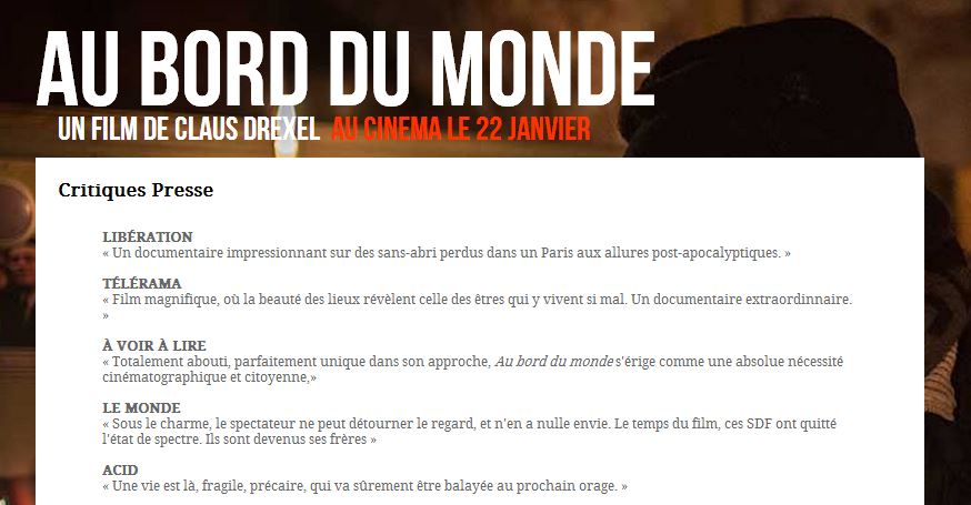 Découvrez un extrait d’Au bord du monde, documentaire qui donne la parole aux Sans Domiciles Fixes, qui interpelle les consciences tout en titillant la sensibilité artistique des spectateurs. Aussi beau que douloureux. Une oeuvre majeure qui ne laissera personne indifférent.