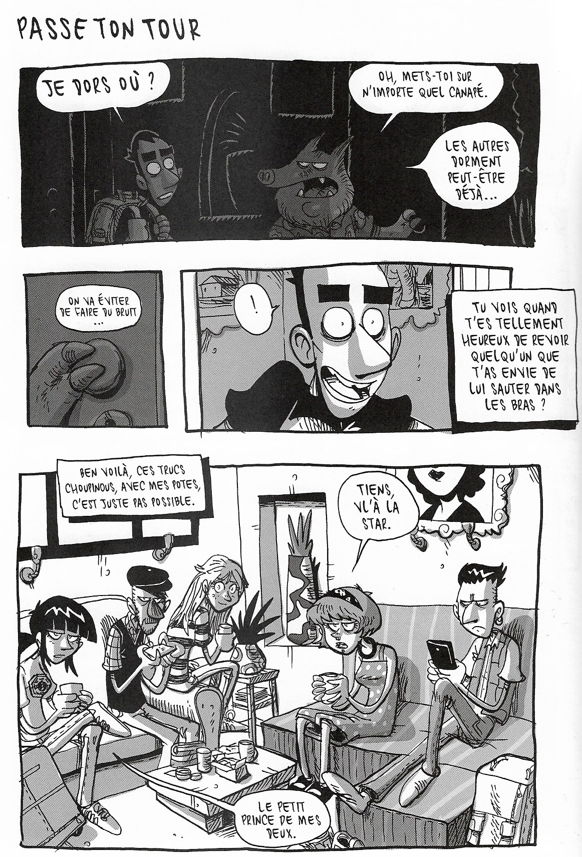 Résumé : Dans ce premier volet d’{Au-delà des décombres}, Zerocalcare explicite les conséquences de son succès éditorial. Dans le train qui l’amène au mariage de Sanglier, il est assailli de messages et de coups de fils qui l’invitent à se rendre à tel micro-événement, à soutenir telle manifestation alternative, à participer à tel débat, etc. Cette situation angoisse profondément Zerocalcare, qui ne dit jamais non, par crainte de décevoir. Les retrouvailles avec sa bande au mariage de son ami sont l’occasion pour l’auteur de peindre la situation délicate de trentenaires italiens englués dans les difficultés économiques et à ce titre incapables de se projeter vers l’avenir. Porté par un profond sentiment de culpabilité, Zerocalcare se laisse entraîner dans un projet éducatif avec ses amis censés leur apporter des subventions de l’État italien…