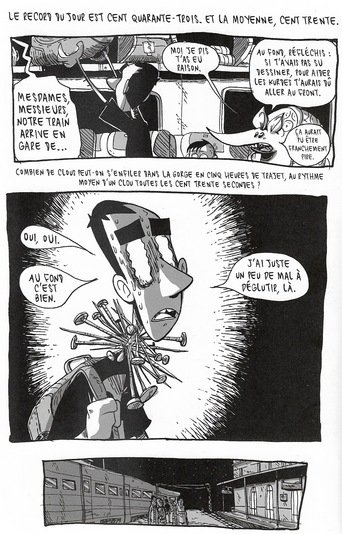 Zerocalcare matérialise ici sa conscience à travers un tatou, et ses angoisses par des clous - ©Michele Reich / Cambourakis pour la traduction française