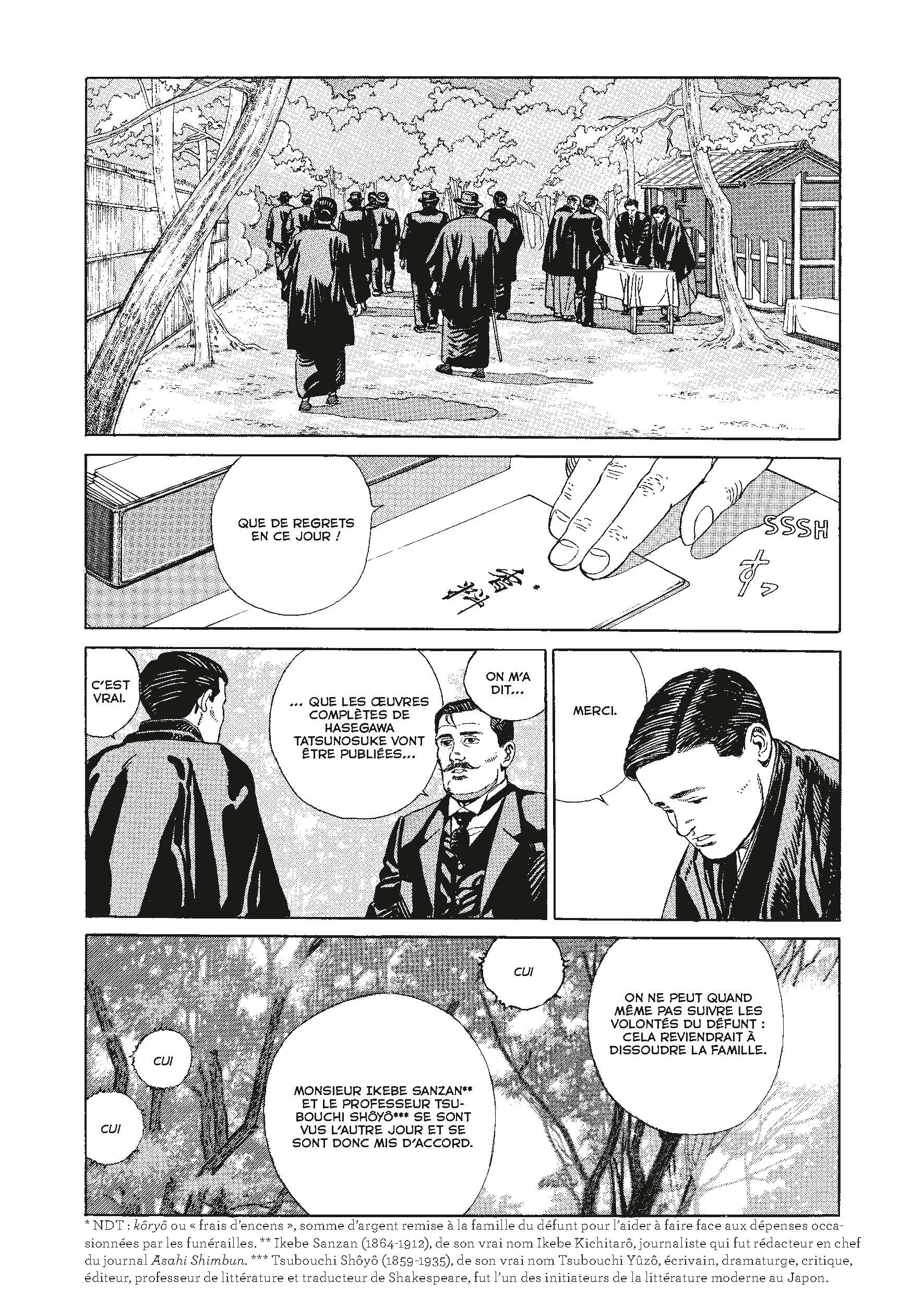 Le style de Taniguchi est désormais incontournable, intemporel et inimitable, un peu comme celui de Proust. Pour ce qui est du graphisme, le trait du Japonais est assurément un talent pur, et ses visages tristes, ses intérieurs traditionnels et ses petites scènes d’action sont de vraies merveilles pour tout amateur du travail de ce mangaka, et du manga en général. Avec cette histoire à tiroirs et qui creuse, dévoile et détaille ce travail de l’écriture, cette question de l’inspiration et de la fuite du temps, Taniguchi est clairement dans son élément, et chacun de se choix, un tissu de vêtement, un jardin à telle saison, un regard dans le vague, devient évident pour que le récit se poursuive sur cette fine ligne qui montre un Japon pas encore tombé dans l’Occident (ce qu’il n’a jamais vraiment fait) mais qui hésite encore (ce qu’il continue de faire).