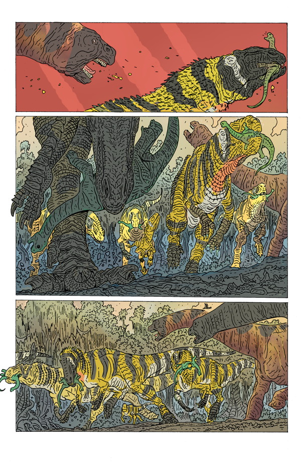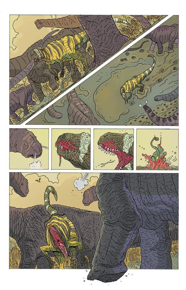 Car la violence est le maître mot de l’ouvrage, fait de sang dégoulinant, de coups de dents et des chair enfoncée. Le moment du carnage infanticide, situé en milieu de l’album, est en cela horrible, dévastateur d’écarlate et du jaune infernal des yeux. Parenthèse pourpre, qui ne doit pas occulter le travail des couleurs, contrastées, bigarrées, pimpantes, seule liberté que s’est offert l’auteur, tant il respecte par ailleurs les formes, corps et habitudes de ces animaux effrayants, qui ont si longtemps dominé la Terre.