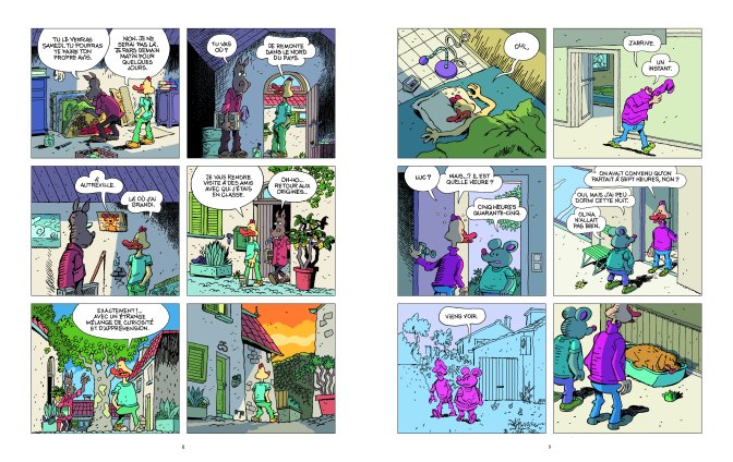 Critique : Ne vous fiez pas aux personnages zoomorphes, au découpage immuable en six cases et aux aplats de couleurs tranchées qui laisseraient penser à une histoire légère ou destinée aux plus jeunes : Autreville est la chronique de la relation amicale d’individus, que l’on devine dans la quarantaine, qui regardent avec trop de nostalgie les moments passé ensemble dans leur jeunesse. À travers une série de dialogues et plusieurs scènes bien peu spectaculaires – et cette absence de spectacle est volontaire chez David de Thuin, qui privilégie le réalisme du portrait pour faciliter l’identification – les personnages se rendent compte qu’ils ne se connaissent pas si bien. C’est dans cette faille que naît le polar, puisqu’à ce constat se superpose le soupçon dans un contexte anxiogène : voilà des mois qu’un tueur en série sévit à Autreville. Étienne, avec sa bizarrerie, son incapacité à nouer une relation sentimentale et ses fréquentes disparitions, pourrait très bien être le tueur, non ?