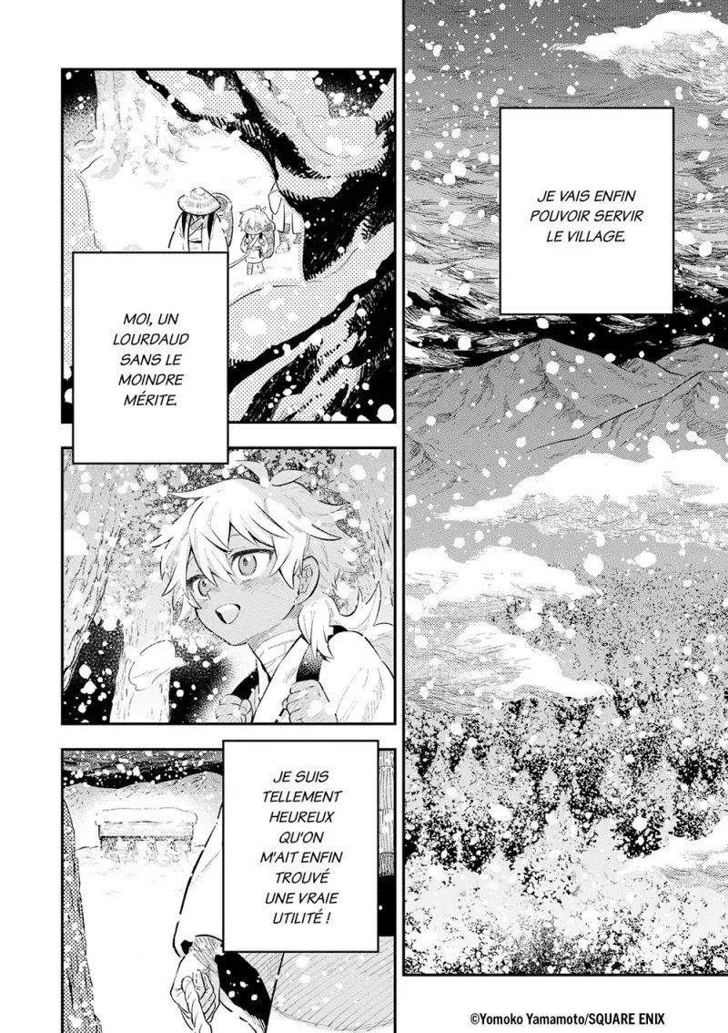 Résumé : Ce premier tome débute avec un vieil homme qui raconte la légende du Dieu Loup qui protège les récoltes du village. Mais l’hiver violent menace la survie du petit hameau. Les offrandes de nourriture ne suffisent plus. Le vieil homme a une idée : il faut donner un cadeau plus consistante à la divinité. Mais qui sacrifier ?