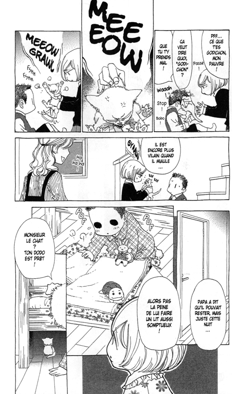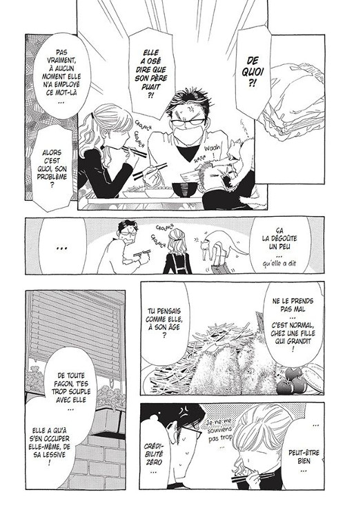 Avec cette œuvre qui entre dans une maison comme un chat, Keiko Nishi a manifestement voulu un shojo autonome, aussi absent qu’incontournable, bref en forme de chat pour donner vie à quelques destins humains. Étrangement, hormis dans les tout derniers chapitres, Shiro n’apparaît jamais comme un chat sympathique : il miaule, griffe, désorganise pas mal le quotidien trop lisse de cette famille. Pourtant, il entre dans le décor, se faufile, se met dans les coins, pour laisser les héros prendre leur place, se confronter à la réalité. Le mariage, l’adultère, les études, le travail, ces étapes qui sont autant de mises à l’épreuve sur un jour, un an ou une dizaine d’années, ne sont pas expliquées, elles sont là, et les personnages les surmontent ou les percutent sans s’apercevoir qu’ils vivent des moments charnières. Cette impression de normalité, voilà le détail scénaristique important, puisque la narration n’est pas interne, mais bien complètement externe, et donc sans jugement aucun.