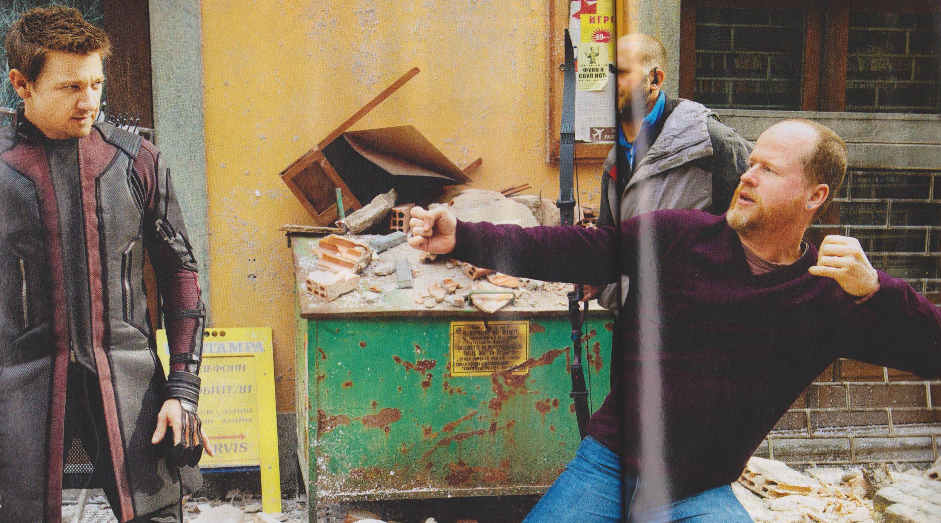 Ci-dessous, le réalisateur Joss Whedon indique à l’archer la meilleure façon de tendre son arc.