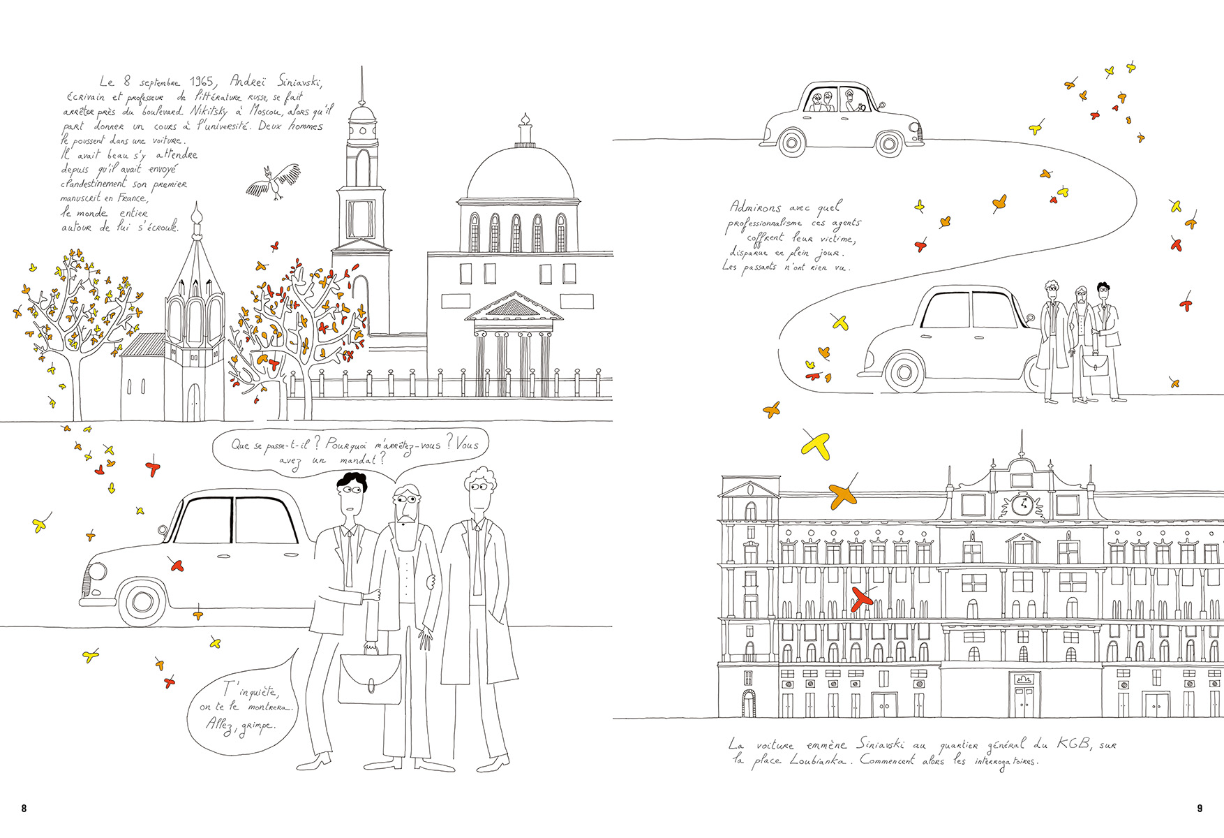 Emma Siniavski entremêle ainsi l’histoire et le portrait de famille, en assumant pleinement sa subjectivité. L’autrice n’a pas à forcer le trait pour convaincre du caractère exceptionnel de la vie de ses grands-parents dans un pays cadenassé par les services secrets, où la délation est un art. Le KGB arrête Andreï Siniavski car ce dernier fait passer en catimini ses textes littéraires par l’intermédiaire d’une amie proche, qui traduit et fait éditer ses écrits en France : Siniavski utilise le pseudonyme d’Abram Tertz, et son double acquiert une certaine notoriété dans l’espace occidental. Son arrestation lorsque le KGB le confond marque le raidissement de l’URSS après une timide période d’ouverture. Le récit tourne habilement en dérision les méthodes soviétiques et se plaît par exemple à raconter les stratégies de contournement opérées par Andreï pour continuer à écrire au goulag, ou la manière dont Maria cache les livres du couple au nez et à la barbe du KGB. Mais la répression finit toujours par s’abattre, et l’album ne cache pas la férocité du régime.