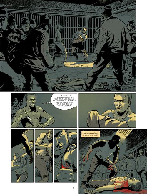 Critique : Ferdinand est plongé dans un des pires endroits de la planète. Il a connu les tranchées sauf qu’ici, il ne s’agit plus de la guerre mais bien des lois infâmes du bagne. Autant dire que Ferdinand n’est pas arrivé au bout de ses peines et qu’il continue à subir de nombreuses injustices. L’intrigue se renforce d’un mystère : quelqu’un semble protéger Ferdinand, tandis qu’une autre personne le menace. Mais qui sont cet ami et cet ennemi tous deux invisibles ? Une énigme à résoudre, alors que Ferdinand fait la connaissance des autres prisonniers. Des liens se tissent, les haines se tendent, comment le héros va-t-il se tirer de ce guêpier et par où le coup va venir ? Cette tension règne sur l’album mais, selon nous, il manque quelque chose au récit pour rendre le personnage plus attachant, pour créer un véritable suspense autour de lui. En fait, Ferdinand ne s’inquiète pas de son sort. Il fait ce qu’il a à faire et accepte que sa vie ne tienne qu’à un fil, même s’il se bat pour survivre. Mais la tension manque dans ce récit, car le protagoniste n’est pas plus inquiet que nous. Il réagit contre l’injustice frappant le seul ami qu’il se fait, le jeune violoniste David, mais prend la vie comme elle vient, suivant pas à pas ses idées.