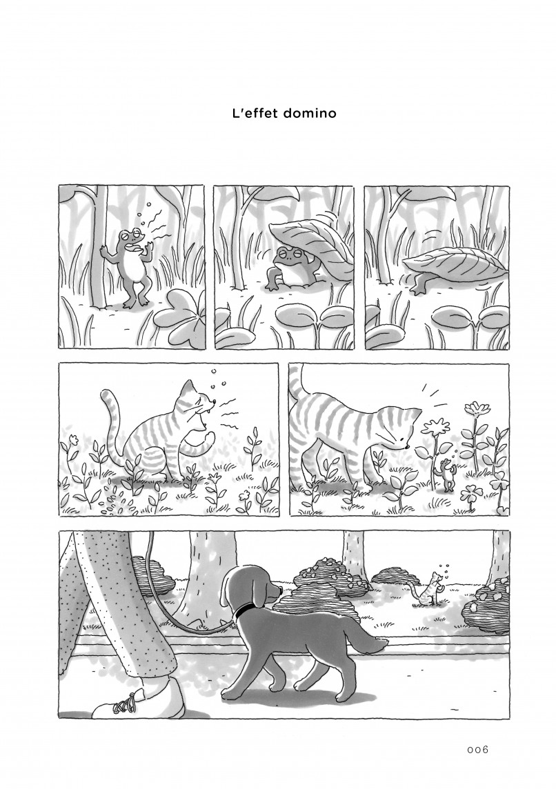 Résumé : {Bâillements de l’après-midi} commence sur un bâillement de grenouille, qui fait bailler un chat, qui fait bailler un chien, qui fait bailler une fillette, qui fait bailler Awako qui fait bailler des oiseaux autour d’elle. Puis, on suit Awako dans sa première aventure printanière, où elle se laisse guider par un chat qui lui montre un raccourci pour attraper son bus...