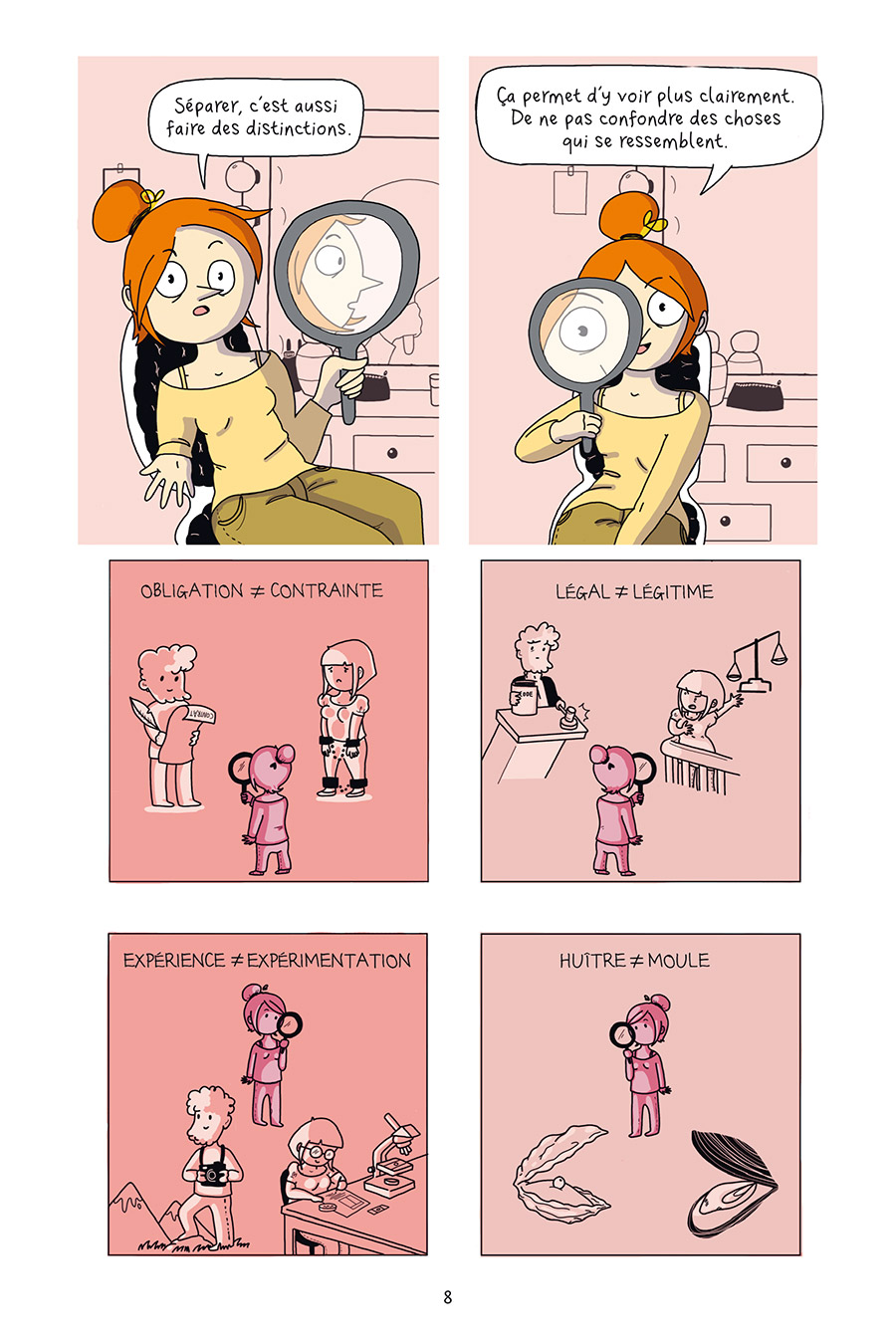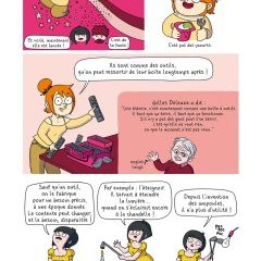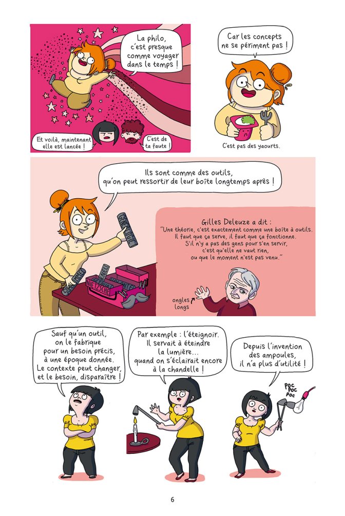 Bien évidemment, le dessin participe à créer un environnement propice à apprendre. Le texte est important, mais chaque pensée, chaque concept, chaque mouvement philosophique est ramené à l’essentiel, dans un résumé condensé et facile à retenir. Le dessin semblait partir dans cette veine, assez simple, avec des couleurs sans prétentions et des personnages essentiellement drôles dans leurs traits, mais finalement, des effets, sur des planches, sur un personnage, se font de plus en plus nombreux au fil des pages. Le talent de dessinatrice est vraiment là, et ce côté un peu loufoque doit cacher un travail de mise en scène, pour donner une originalité et une charpente à l’édifice.