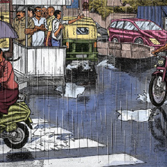 Michel Polnarref chantait "la rue", Simon Latouret la dessine, sans se censurer ou se restreindre à un format. Après le récit original de l’Alcazar, c’est un pan entier de Bangalore qui se raconte, et prend vie. Les doubles pages sont splendides, sans couleurs effarantes, mais avec des visages, des tuniques et des véhicules réels, souvent cabossés ou imparfaits. Les strips sans dialogue témoignent d’un génie à la Eisner ou Sempé, rappelant que la ville reste un terrain de jeu illimité pour les dessinateurs qui savent l’appréhender. On sent un attachement viscéral à ce capharnaüm permanent, ou à ces cacophonies qui n’ont pas besoin de mots, et c’est là aussi la marque des plus grands.