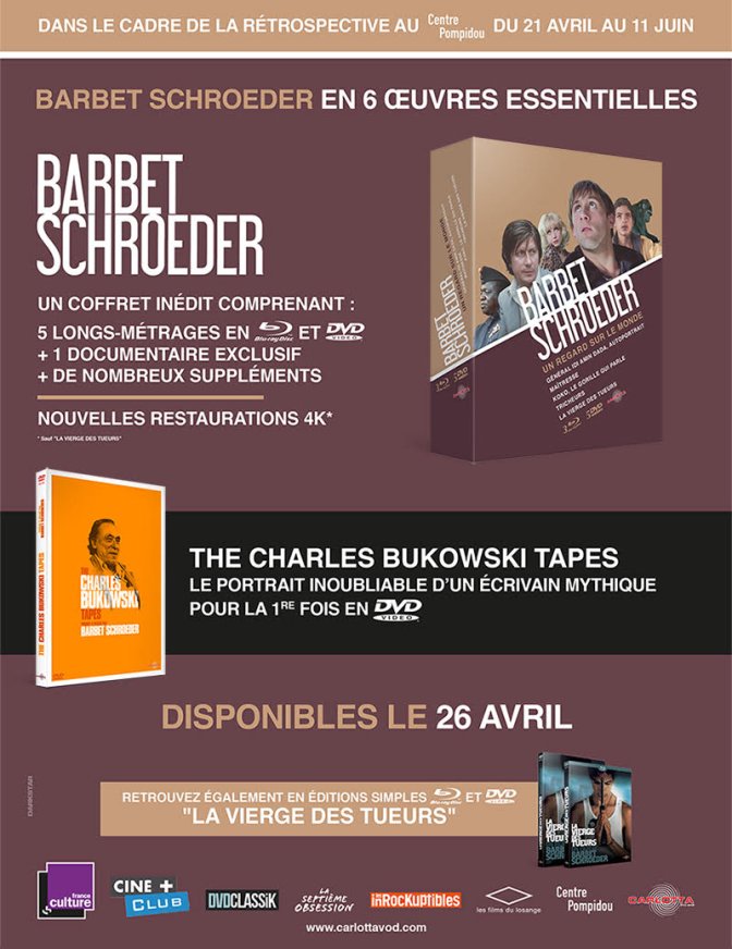 Carlotta propose également, hors coffret, une édition du portrait que Schroeder à livrer sur le romancier Bukowski, The Charles Bukowski Tapes en 1984. Il s’agit de passionnantes conversations avec l’auteur du Contes de la folie ordinaire qui lui proposera le scénario imbibé d’alcool de Barfly, en 1986. Le DVD, fort de ses 50 monologues exclusifs, est accompagné d’un livret de 12 pages.