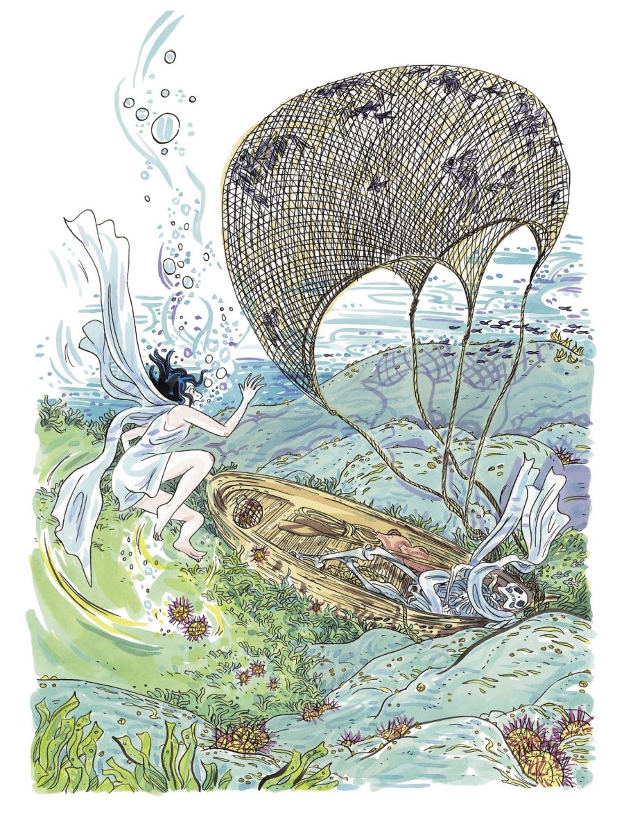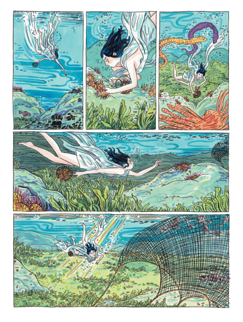 Pour signer et signaler cet imposant album, la dessinatrice s’est appuyée sur un style clair, longiligne, aux couleurs tonifiantes et lumineuses. Ainsi, certains personnages semblent flotter, qu’elles soient sous l’eau ou sur terre, un air gracieux s’emparant naturellement de l’une des deux, l’autre se révélant plus terre à terre, et donc plus souvent les pieds ancrés au sol. Dieux et mortels se distinguent ainsi, tandis que leurs traits se confondent : Apollon n’est pas beau, il impose sa carrure et sa volonté sexuelle aux autres, les nymphes ne resplendissent pas, mais elles brillent selon les moments et bruissent selon leurs interlocuteurs. Partout, des de roches roses, de palais violets ou d’arbres d’émeraude rythment un décor de pays imaginaire, où beaucoup de lieux semblent trop près les uns des autres mais se distinguent tout de même, comme les niveaux d’un jeu vidéo ou les strates d’une peinture contemporaine.