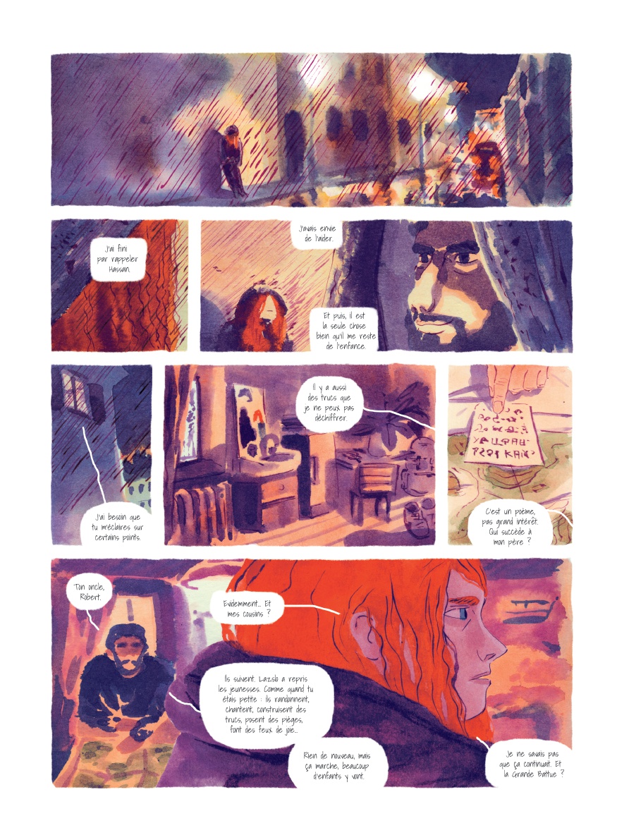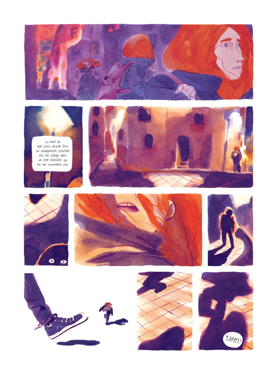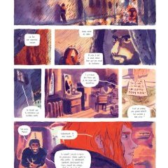 Le travail à l’aquarelle de Lilian Coquillard (qui avait déjà été fort remarqué en 2011 pour Les Peuples oubliés, sur un scénario de Julien Berteaux) transcende véritablement ce récit étouffant. Le dessinateur définit un nuancier quelque peu restreint pour préserver une cohérence générale à l’album comme le ferait le directeur de photographie d’un film. Entre l’éclat du rouge qui peut virer au sang et la pesanteur du bleu menaçant de sombrer dans l’opacité et avaler ou dissimuler les personnages, Lilian Coquillard élabore des atmosphères particulièrement prenantes et immersives. L’expressivité des couleurs et l’usage vaporeux de l’aquarelle interprètent à eux-seuls une partie de la tension dramatique qui se joue dans les planches. Donnant de la vigueur aux plages d’encres et précisant les formes, des traits viennent dessiner les corps et parties importantes de l’image : de très beaux échangent s’opèrent alors, entre le pinceau imbibé qui esquisse et celui, plus soigneux, qui indique. On ressent un réel plaisir à l’image, une grande générosité dans le dessin qui se traduit dans par belle énergie créative qui se soucie davantage de bien raconter l’histoire plutôt que de réaliser une histoire joliment illustrée. Les planches n’en font que gagner en force, en percussion, en source de respiration et en intelligence graphique.