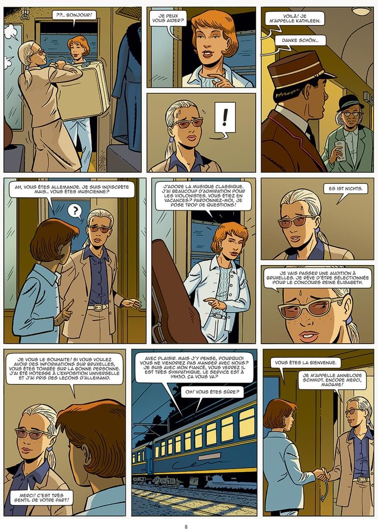 Résumé : À l’aube de sa cinquième aventure, Kathleen, accompagnée de son compagnon Bernard, rentre de vacances à bord de l’historique auto-couchette en direction de Bruxelles. Au hasard d’un couloir, elle fait la connaissance d’Annelore, qui rêve du concours Élisabeth et avec qui elle sympathise. La musicienne est de fait invitée à se joindre au couple pour le repas. Le soir, alors que Kathleen a rejoint le wagon-restaurant, le train s’arrête brutalement. Quelqu’un a actionné le signal d’alarme et la mystérieuse violoniste allemande s’est envolée, abandonnant son précieux instrument sur la banquette de son compartiment. Kathleen le récupère et, intriguée, se lance dans une enquête à travers l’Europe de la Guerre Froide, qui la conduira jusque de l’autre côté du mur. Notre rocambolesque hôtesse de l’air croise sur son trajet nombre de personnages opportunément décidés à lui faciliter la tache... Mais pourquoi la STASI épie-t-elle ses moindres mouvements ?