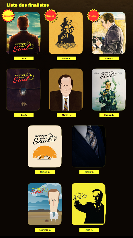 Better Call Saul, la série carton de ce début d’année 2015, spin-off et prequel de Breaking Bad, mettant en scène l’avocat de Walter White, Saul Goodman (Bob Odenkirk), a déjà des nominations aux Emy Awards et un démarrage record à son actif. Sony Pictures Home Entertainment a mis en place une compétition pour permettre aux fans de créer le visuel définitif de l’édition collector Steelbook blu-ray, qui paraîtra le 18 novembre. Les créateurs de la série, Vince Gilligan & Peter Gould viennent de trancher.