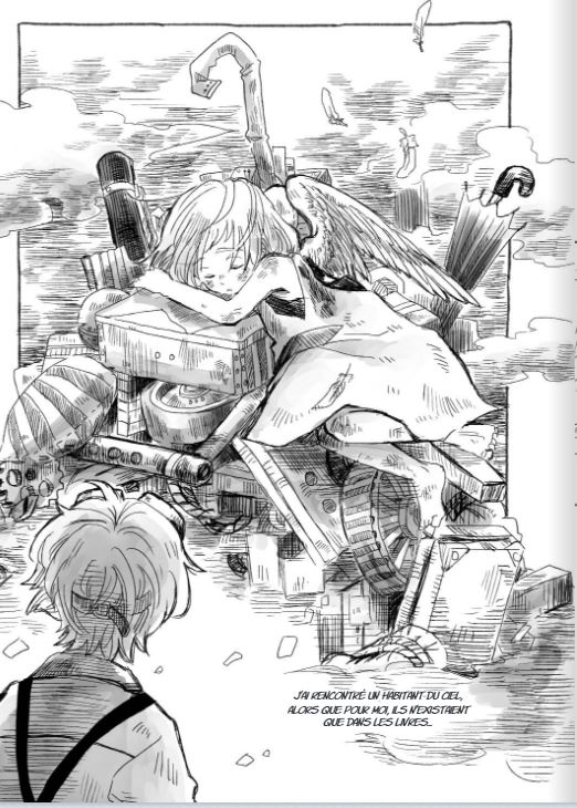 La force de Beyonds the Clouds ne réside pas dans son scénario qui est assez classique mais réside dans son graphisme original et dans l’ambiance que ce premier tome installe. Légèreté et poésie se dégagent grâce au trait atypique et travaillé de Nicke qui n’est pas sans faire penser aux layout des films du studio Ghibli. Chaque case est un petit bijou. On a l’impression d’être plongé dans un carnet de croquis d’un peintre aquarelliste même si le manga est en noir et blanc.